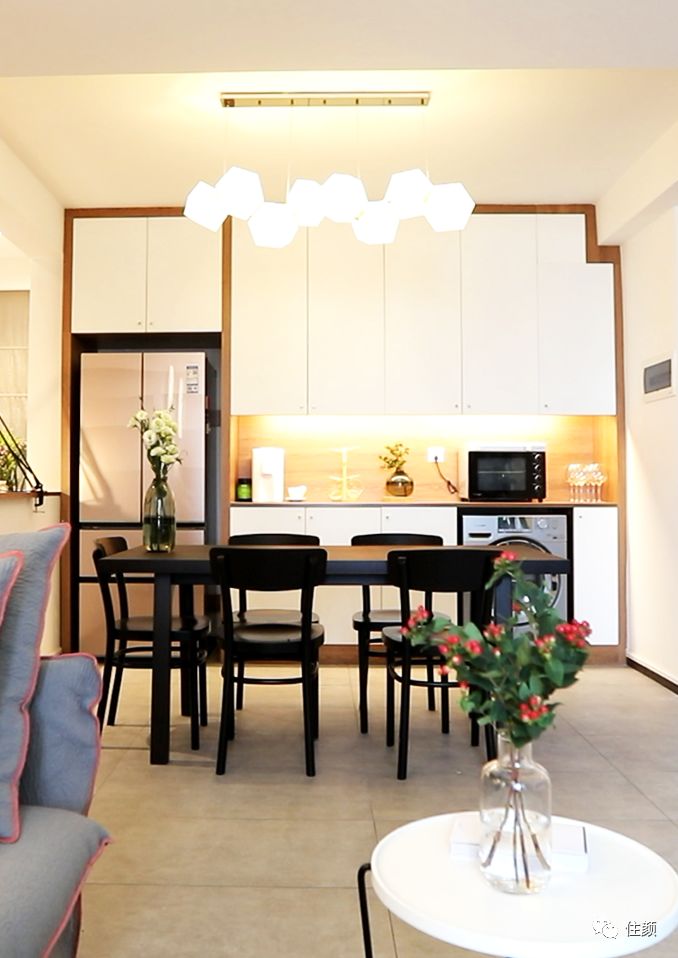 并入小阳台的餐厅,宽敞许多,这里不仅仅是餐厅,也是屋主待客开趴的好地方