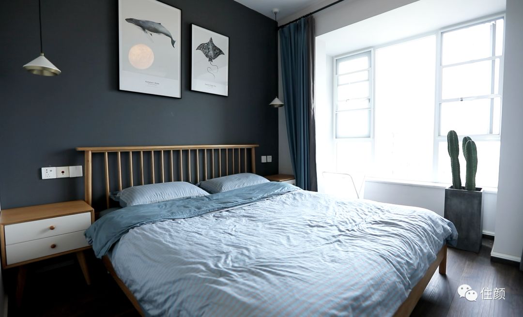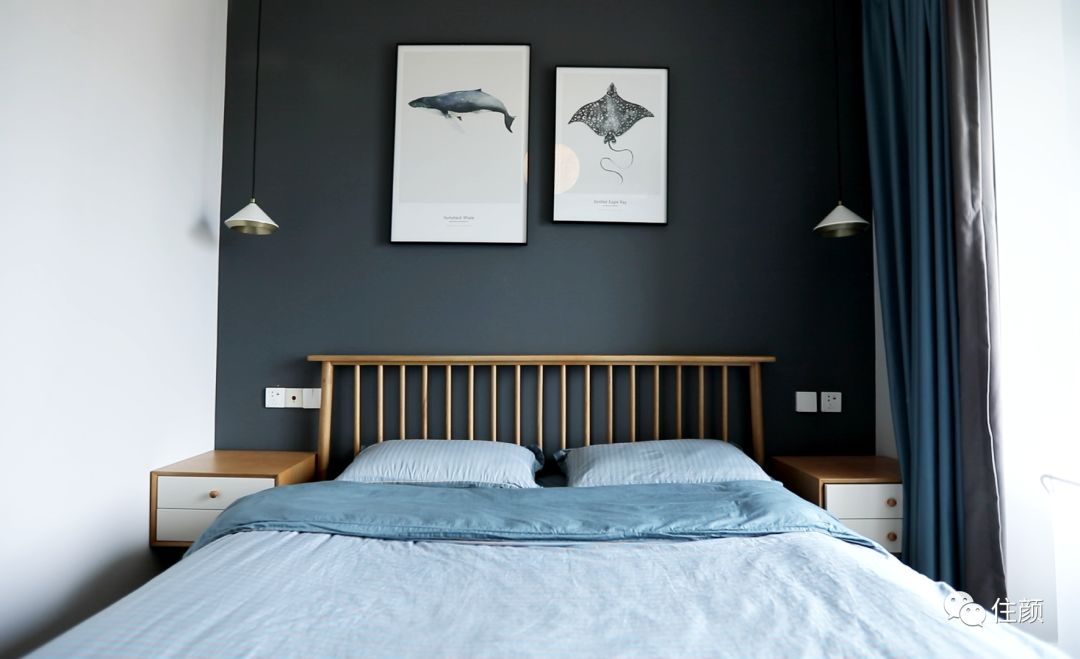 深灰色的背景墙,是助眠的颜色,床与床头柜都采用了雅致的橡木,给卧室增添温馨感,床两侧的吊灯、画框与床的线条相结合,再一次展现古洋这个男孩子的精致心