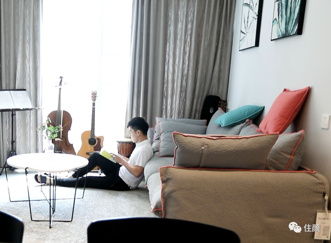 古洋曾有过做诗人的梦想,并且向往自由自在的生活,这些梦想与向往也体现在他家的布置和设计上:宽敞明亮的空间,沙发边上的提琴和吉他、嵌入墙体的书柜、整体风格简约又淡然