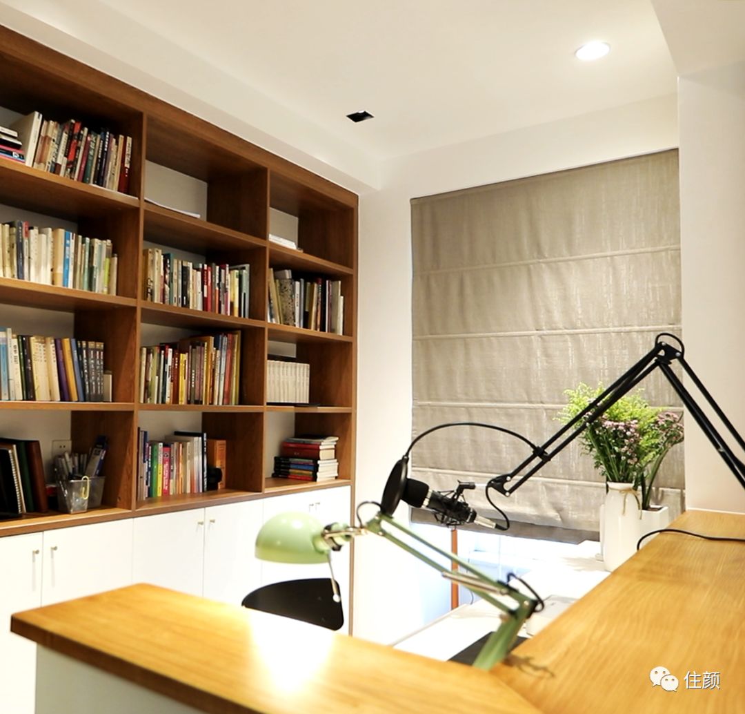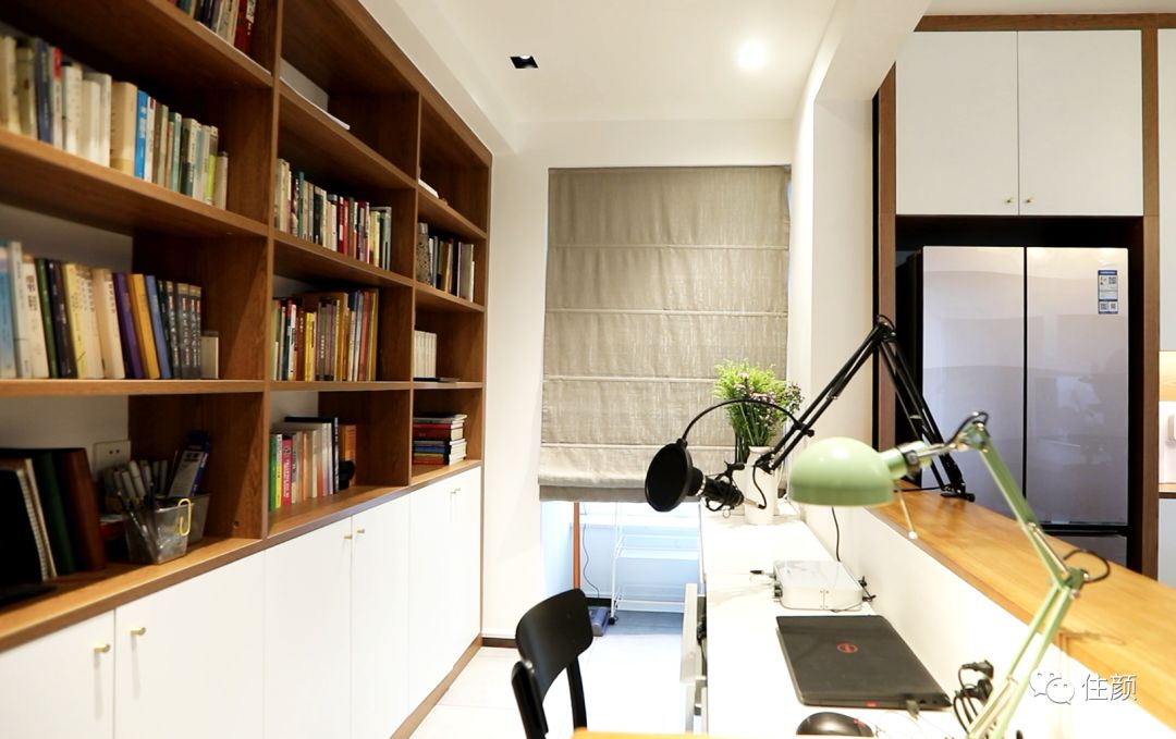 工作区位于餐厅的一角,古洋对于这片区域,可以说是情有独钟,关键还要说设计的巧妙,整排的书柜自不必说,玄机都在「转角桌」上