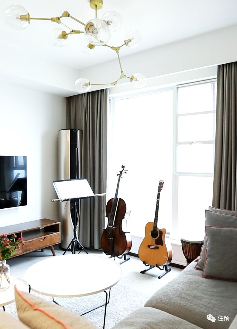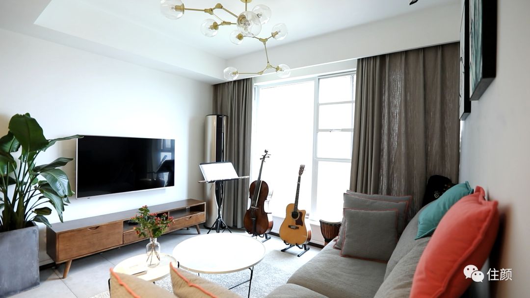 沙发对面的木质电视柜,深色系的点缀,则让空间「稳」下来