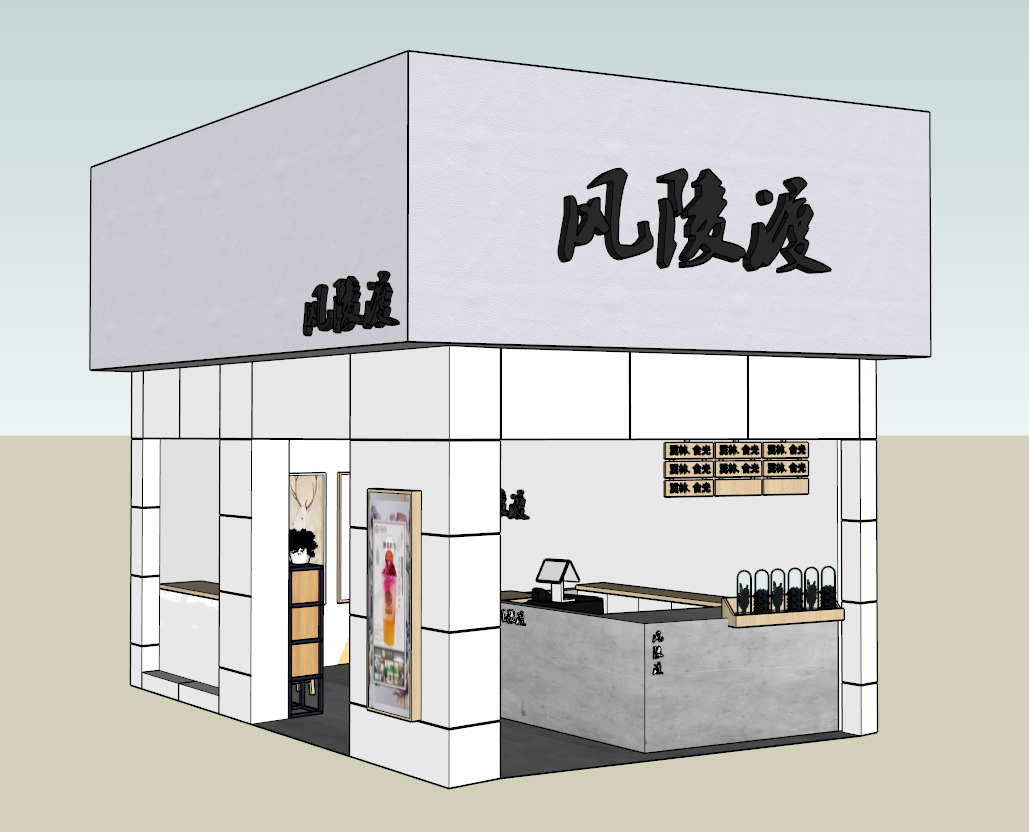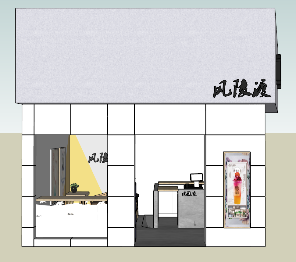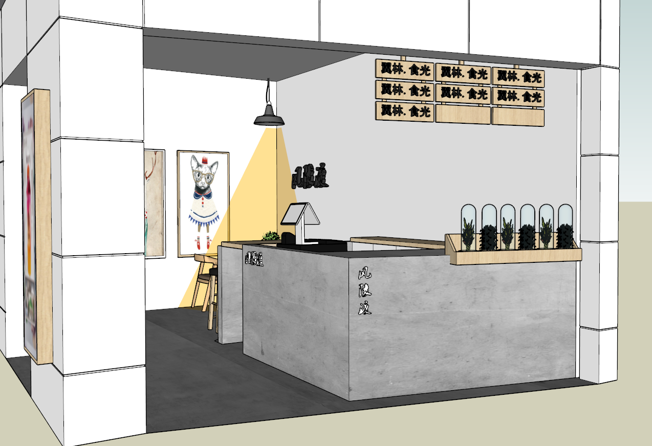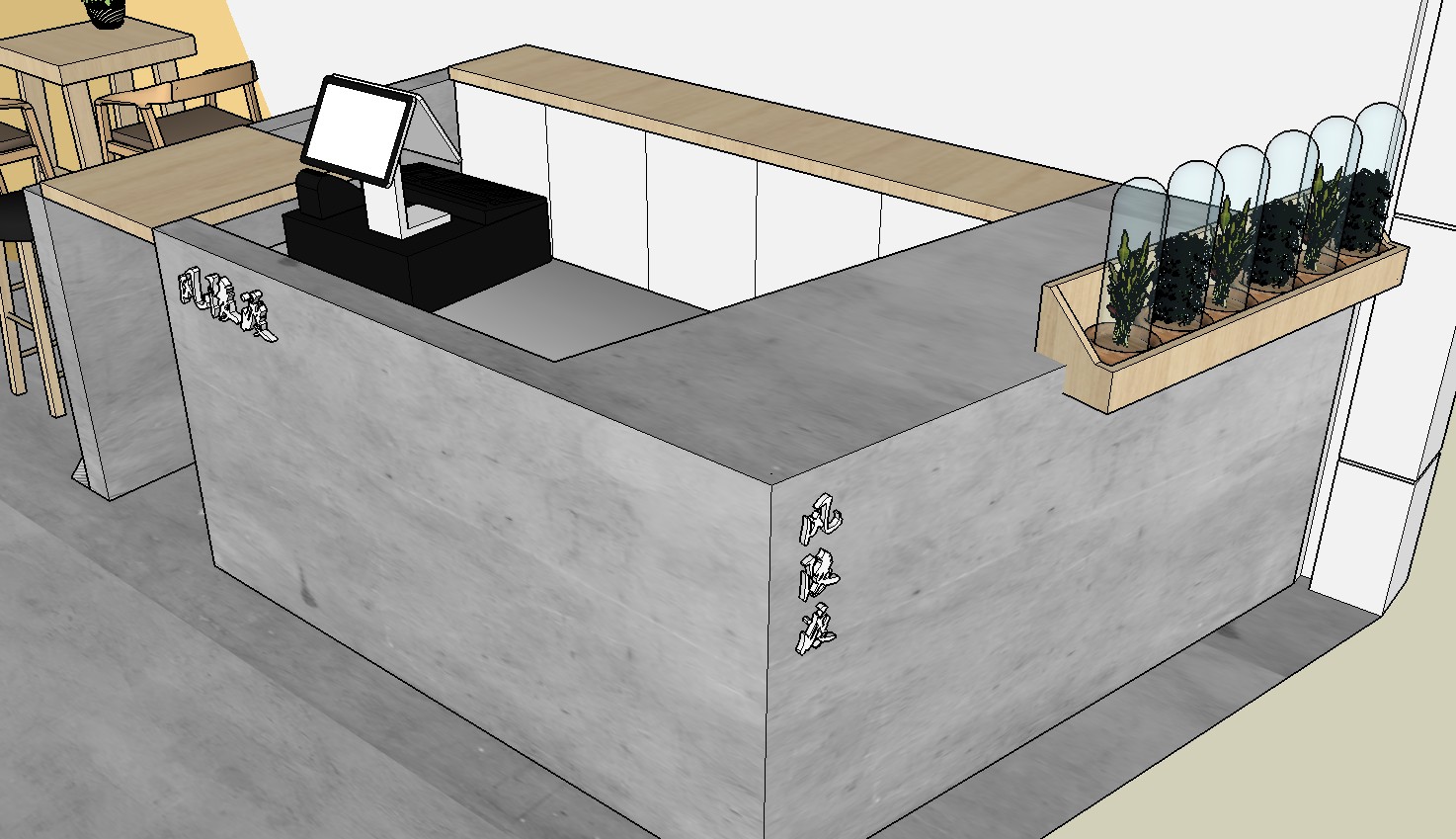 (模型图:侧面)考虑到店铺位置位于街道转角处,所以打通了店铺侧面的墙壁,收银台设计时巧妙处理,方便店主能同时关注到两边门口的进客。