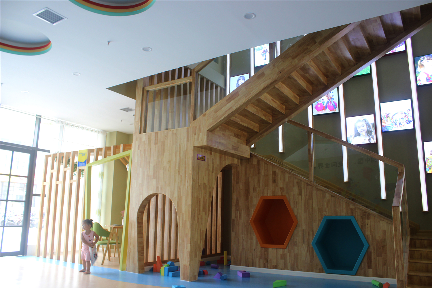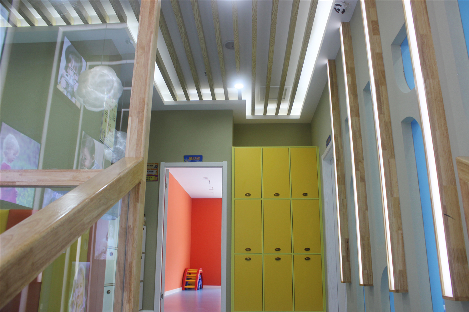 这个方案大量的采用了橡木板与其他木质元素,从整体上体现环保、以人为本的设计思想,采用丰富多彩的颜色搭配,打造一个充满了童趣的空间。