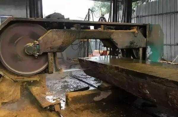 用专门的大板切割机(皮带锯、卧锯),皮带锯一般切割相对密度小的木材,卧锯一般切割密度大木材(如:巴花,卧锯切割平整,损耗小);将木头根据设计师的规格,一块块切割出来。这就是开始切片啦,越到中心板子越宽,当然也最贵啦▼