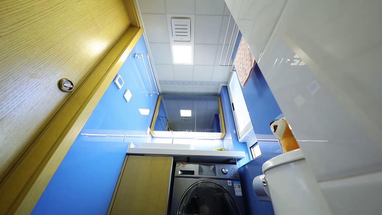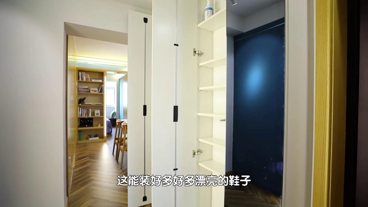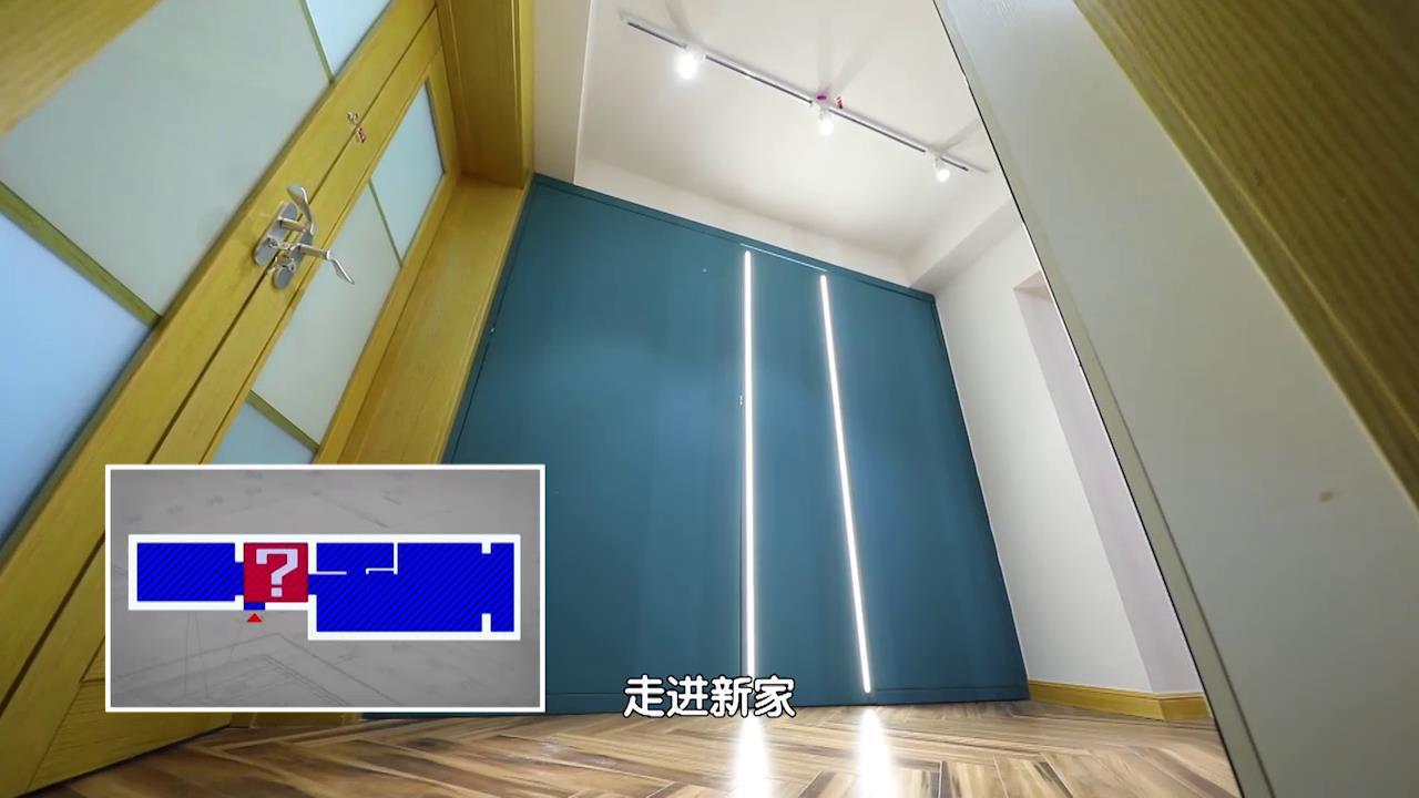 走进新家,首先看到的是一整面蓝色的柜子,白色的线型灯带拉伸空...