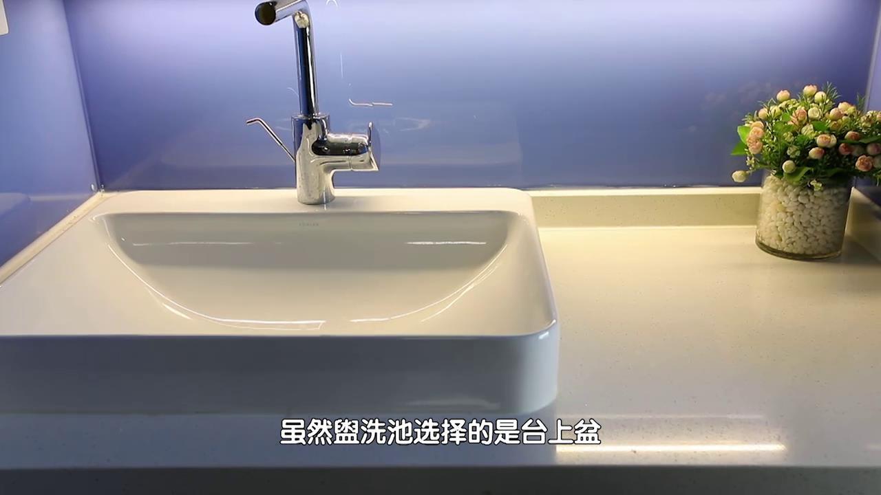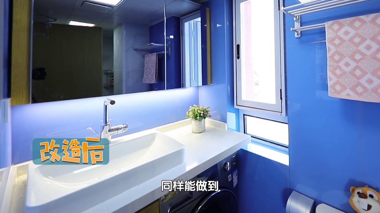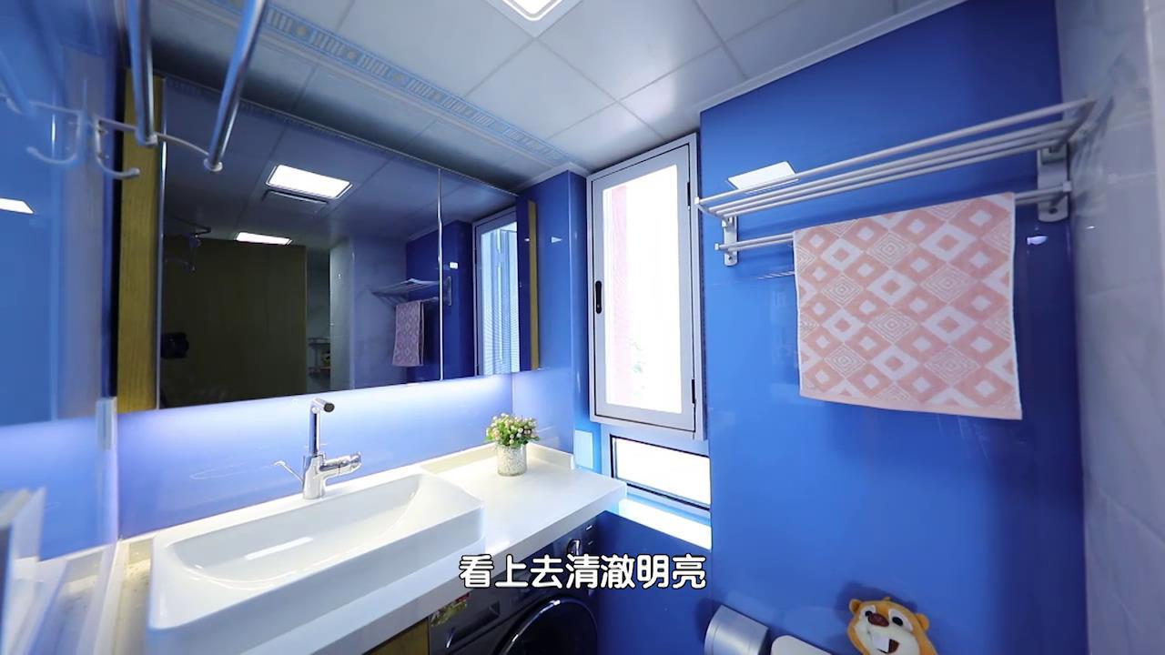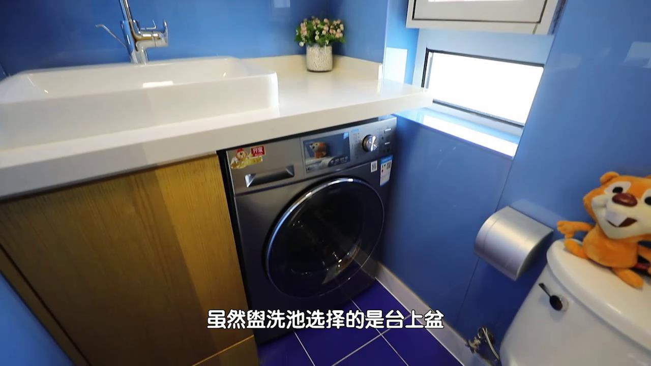 如今设计师将卫生间和主卧之间的墙向外扩展了近一米,实现干湿分离。蓝色的玻璃墙面和白色的瓷砖从视觉上将空间进行划分,在阳光的照射下,看上去清澈明亮。不仅如此王静还发现,原本狭小的卫生间如今竟能放下一个超大的盥洗池。在原先150平米的家里王静可以轻松自在地洗衣服,如今在50平米新家的卫生间同样能做到。我们注意到,洗衣机藏在了盥洗池台面的下方,虽然盥洗池选择的是台上盆,但身高一米二的妞妞使用起来却刚刚好,究竟是怎么回事呢? 暖暖的新家