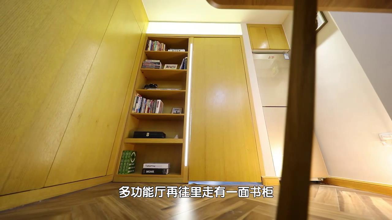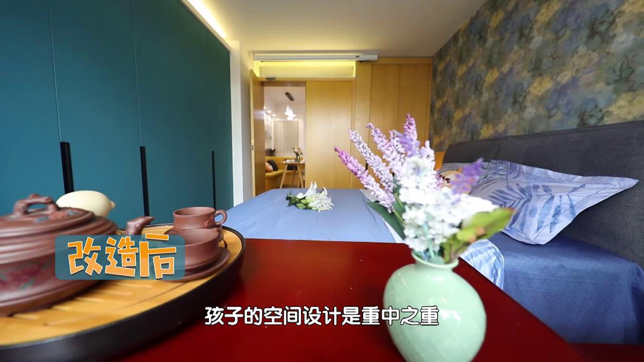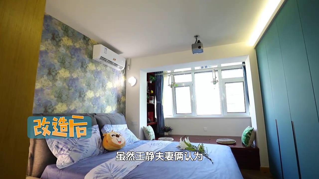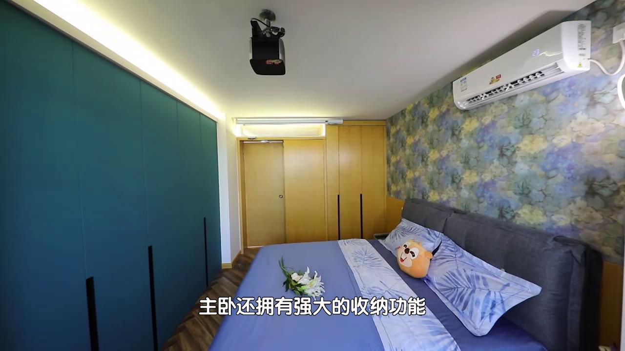 虽然王静夫妻俩认为孩子的空间设计是重中之重,但是设计师江林生并没有忽视他们生活的舒适性。蓝色能让人的心静下来,设计师希望王静夫妻俩在这里,身心都能得到彻底的放松。主卧除了睡眠模式,原来还有影院模式。除此之外,主卧还拥有强大的收纳功能。设计师在客厅和主卧之间新加了一小段隔断墙,给了冰箱一个最佳的安身之所,而它的另一侧则利用其宽度做了一整面墙的蓝色柜子。另一侧墙面也做了一整排柜子,里面详细的功能分区,对于王静来说更加方便她分类和打理衣物。 暖暖的新家