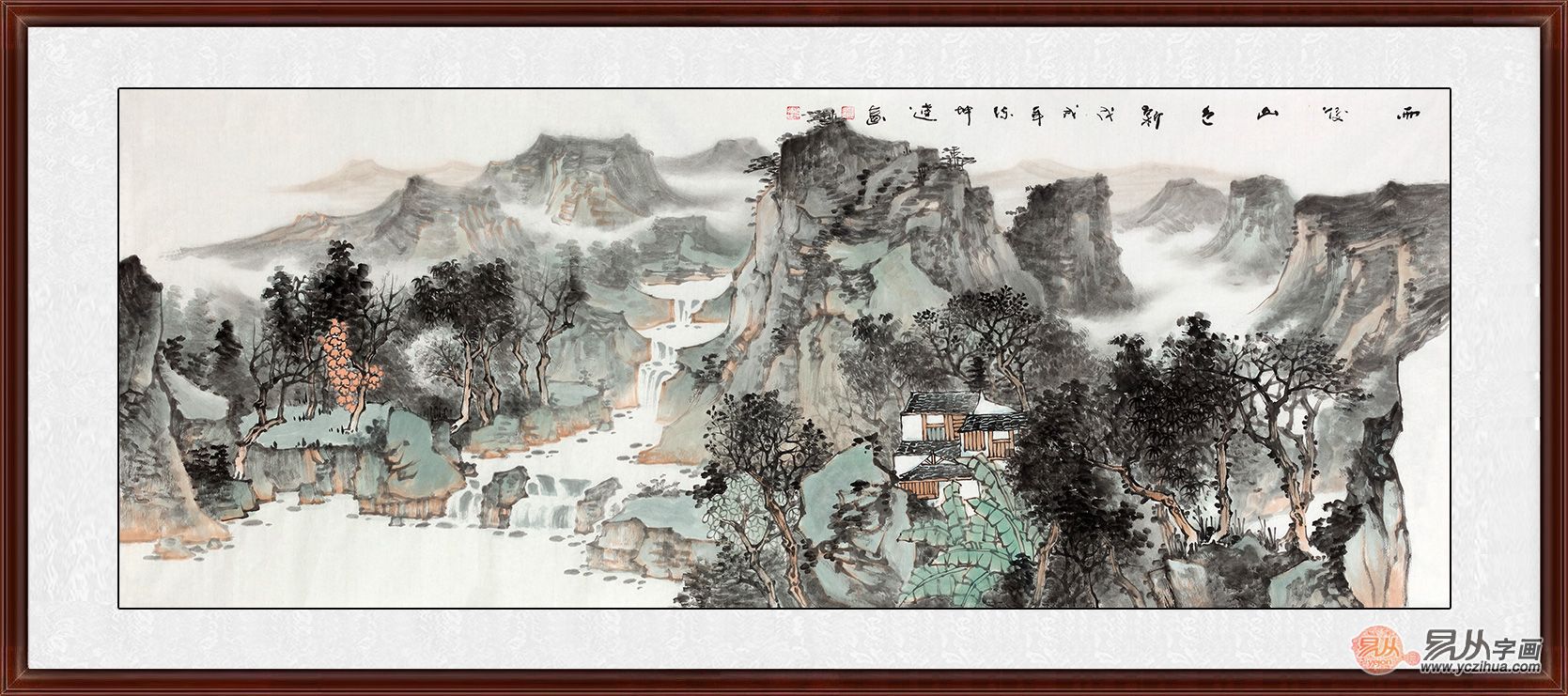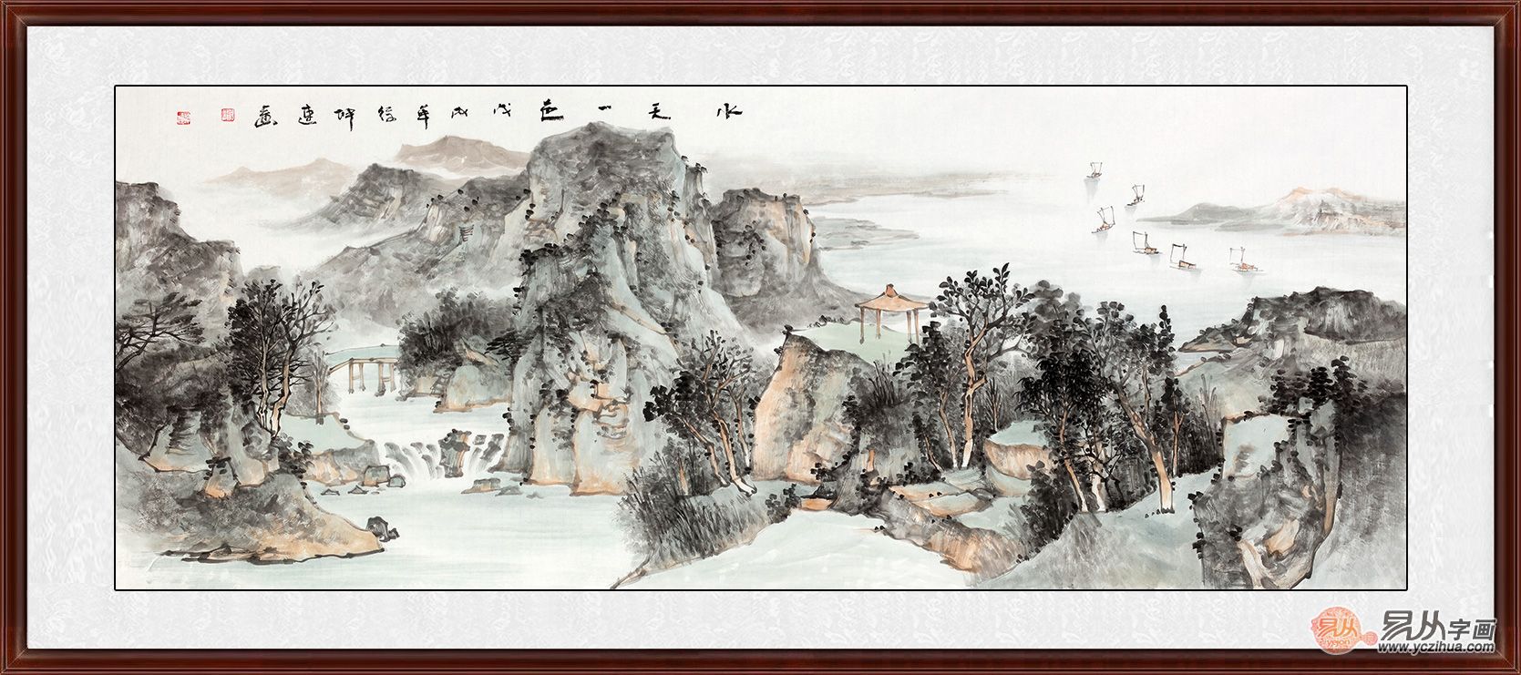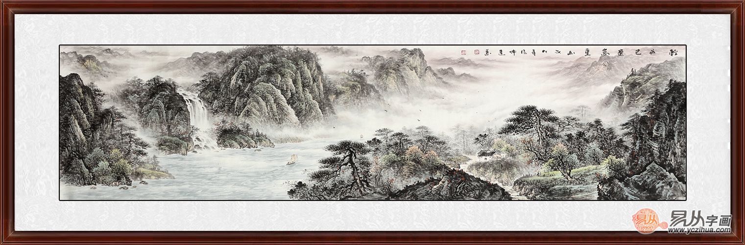 徐坤连的山水画给人最大的感觉便是胸怀宽广气魄宏大,近处山峰奇石用重笔描绘,色彩浓重,凸显了山石的质感,同时近处的山石描绘细致,用笔精巧,且形状走向不同,感觉也是各不相同;而生长在悬崖峭壁上面的松树郁郁葱葱,体现了生机勃勃。而稍远处的流水瀑布描绘细致具有灵气,宛如活水一般;水流旁边的平台和山脉描绘的非常有真实之感,与流水构成了美丽的画面。最远处天边的山峰怎有变成了鲜艳的红色,仿佛是映照成了美丽的色彩,体现了一种温和之感。经典山水装饰画推荐三、山野秀景,自然古朴画家徐坤连六尺山水画新品《水天一色》来源:易从网