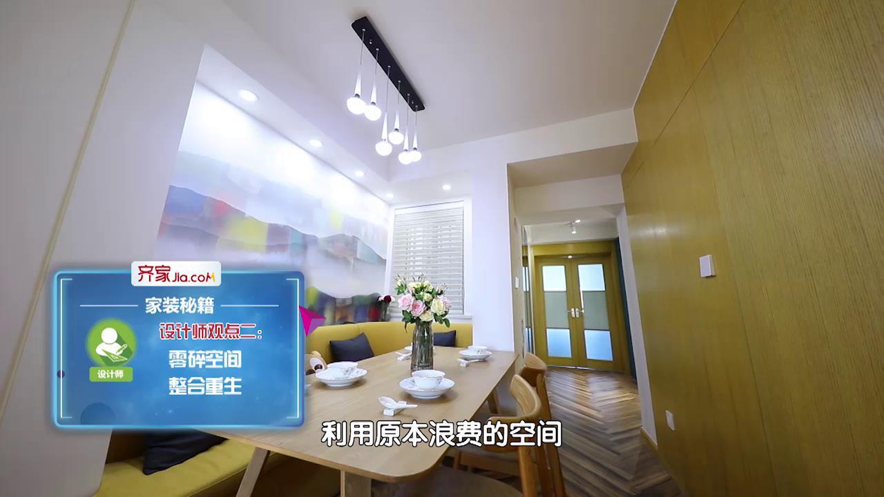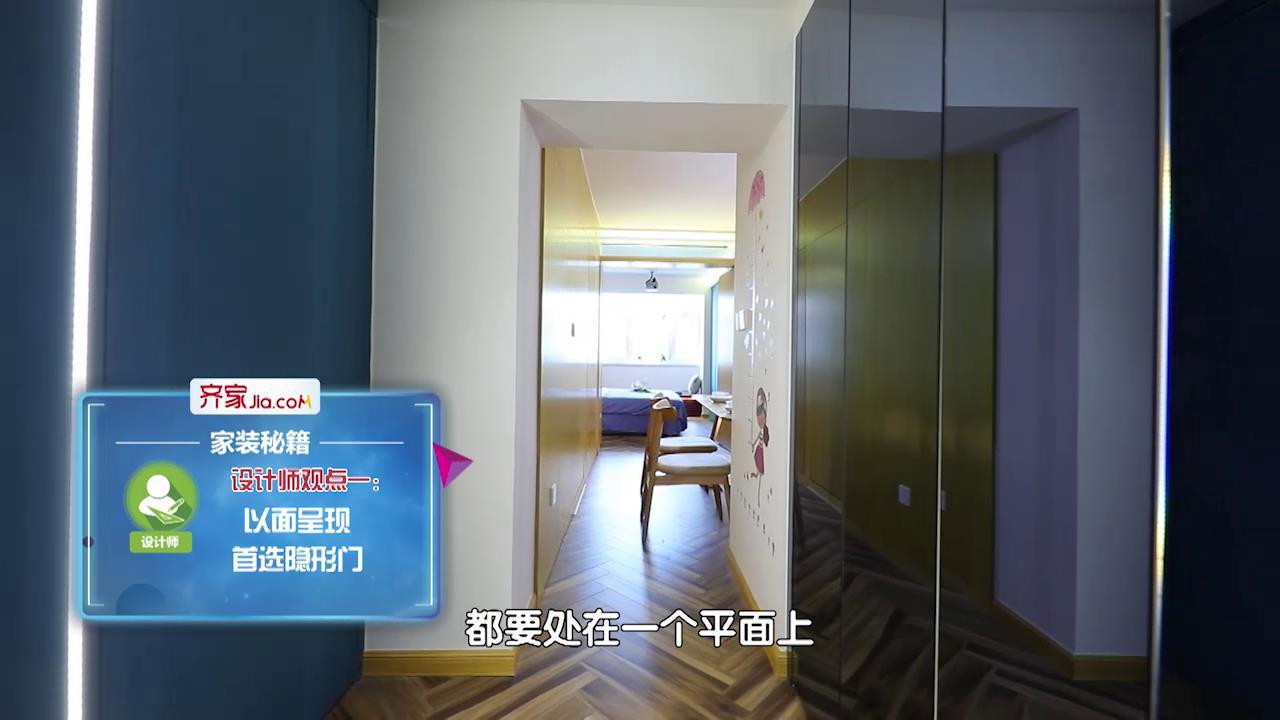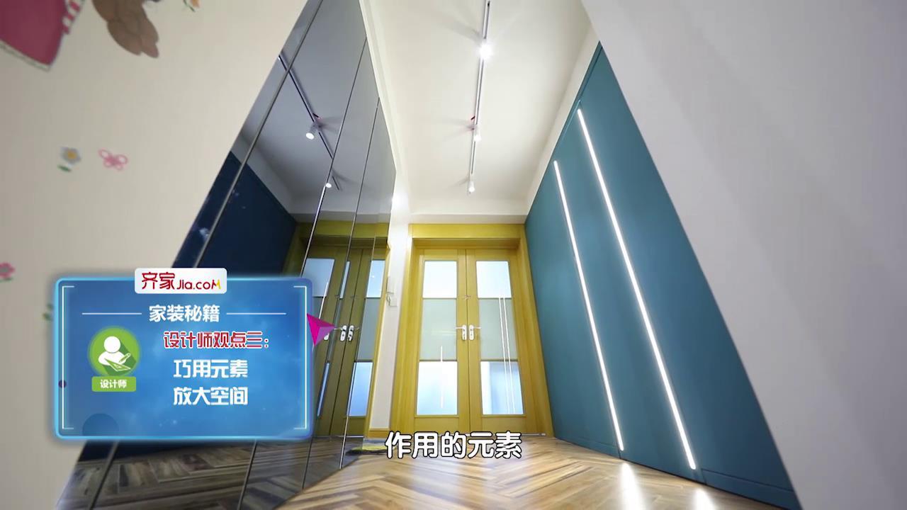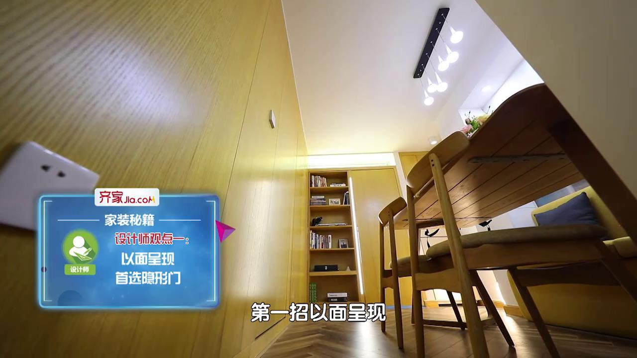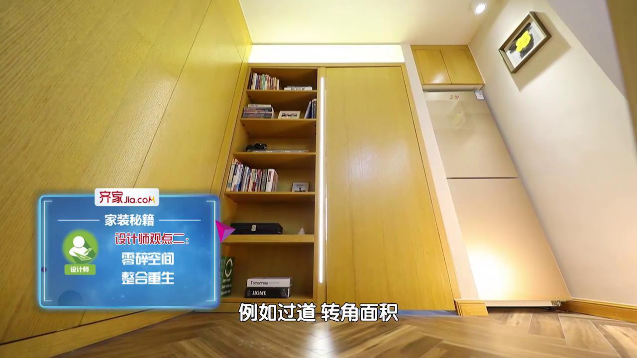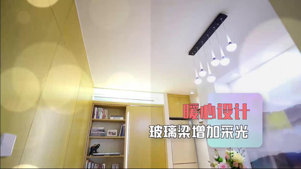 第二招:想方设法利用原本浪费的空间,例如过道、转角面积,让零碎空间规整重生。第三招:巧用具有扩大空间作用的元素,例如地板采用人字拼法、镜面、灯光设计等,电视剧前的观众您学会了吗?暖心设计二:玻璃梁增加采光由于多功能厅属于暗厅,为了增加采光,设计师江林生在它和主卧之间的书柜上方增加了一道玻璃材质的横梁,可以有效的将主卧的采光引进来。 暖暖的新家