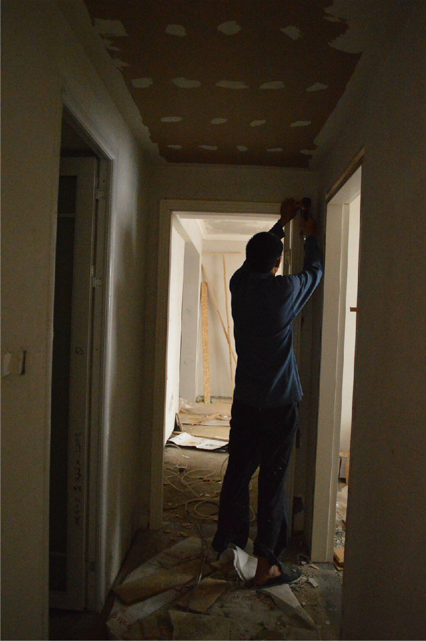 图为师傅在打钉子,没有开灯,所以光线有点暗。下面看看徒弟做的事情。