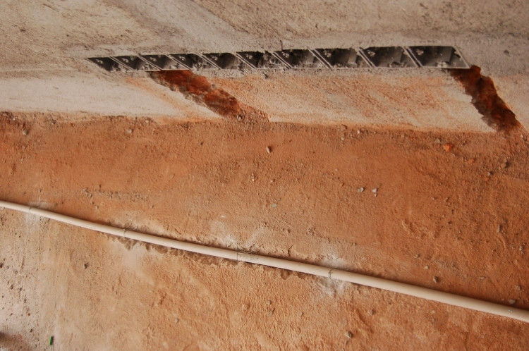 电视柜旁边有通向阳台的水管,也得打槽走,上面是线管。