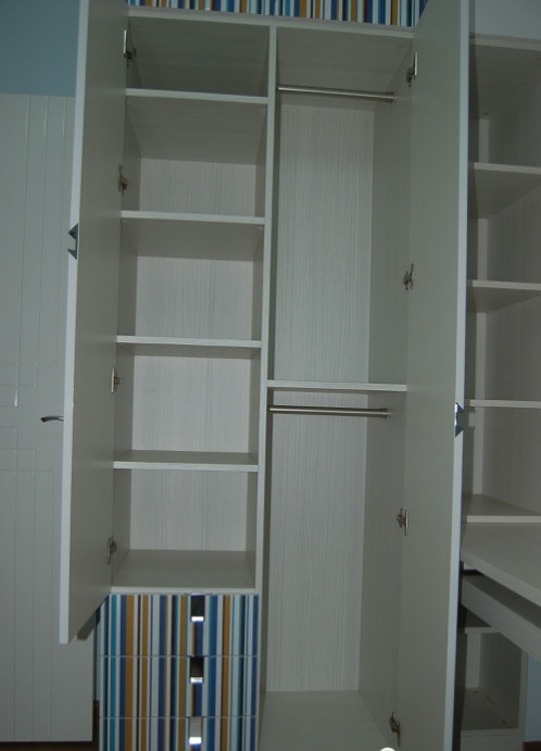 颜色搭配上,小孩房风格比较活泼, 衣柜宽度1米,收纳位,抽屉,挂衣区三个部分。