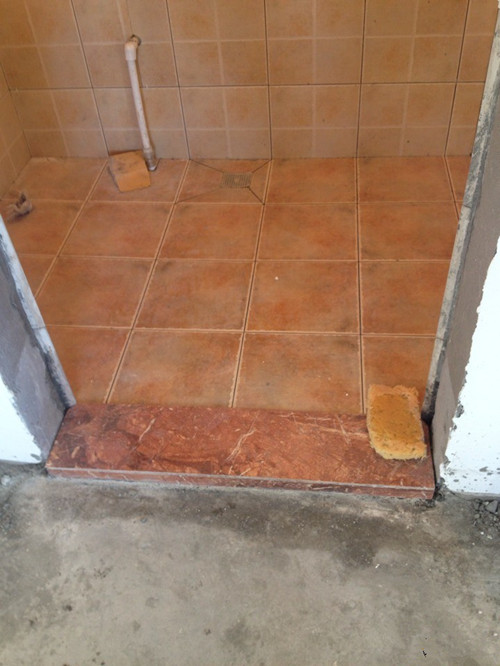 地漏的位置正好在一块瓷砖的中间,师傅把砖分成4块,每块都有个小坡度,有点不太好看,但是这样走水最好了。师傅考虑的很细心。