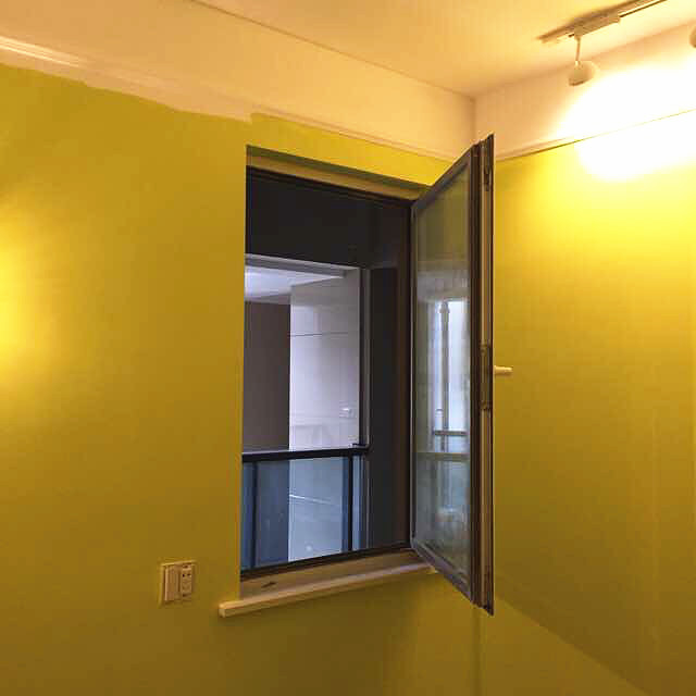 儿童房的墙漆是黄绿色调,放在桶里看着像荧光色,在这个北面小黑屋里,开着灯偏黄色。