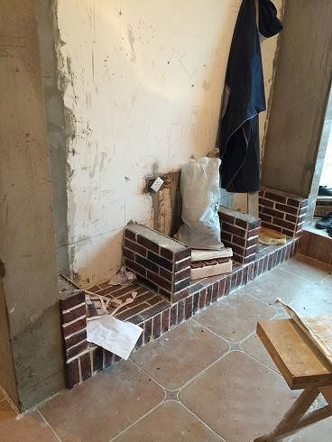 同样风格的砖砌电视柜,上面还差木工师傅来做一块板。
