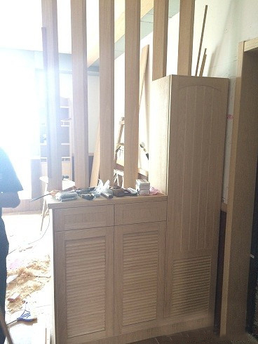 入口鞋柜,鞋柜上的木条尺寸棒哥和大赵师傅两个人细细讨论很久。