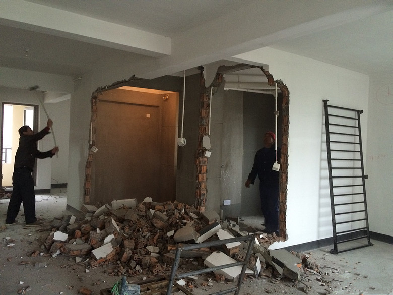 一开始项目经理木有出现,所以只能敲我确定的地方,老刘团队三个人,吭哧吭哧速度杠杠的,没一会我家厨房和卫生间就变成这样了。