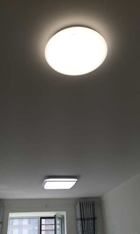 下面一张是从入户门处照的效果,餐厅灯比客厅灯大了很多啊。