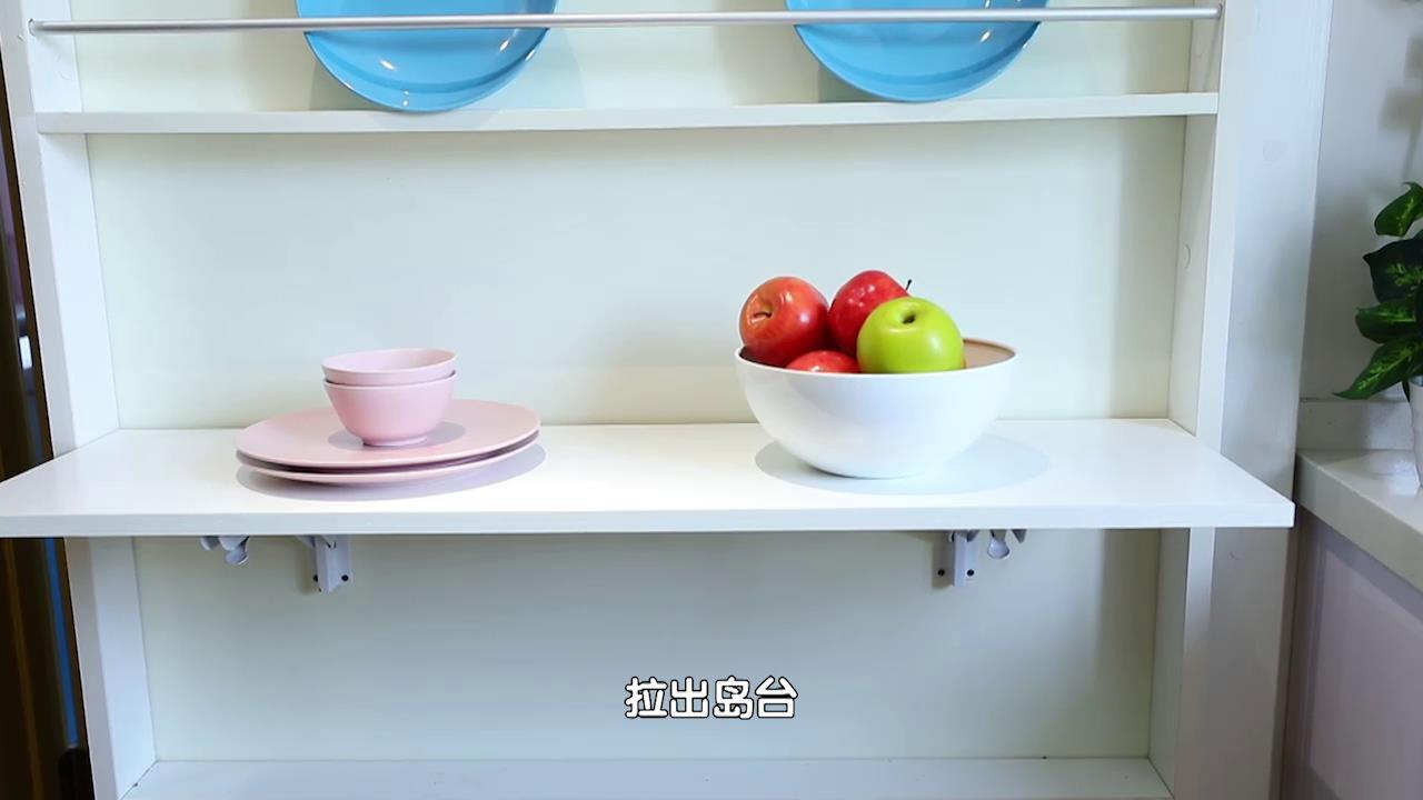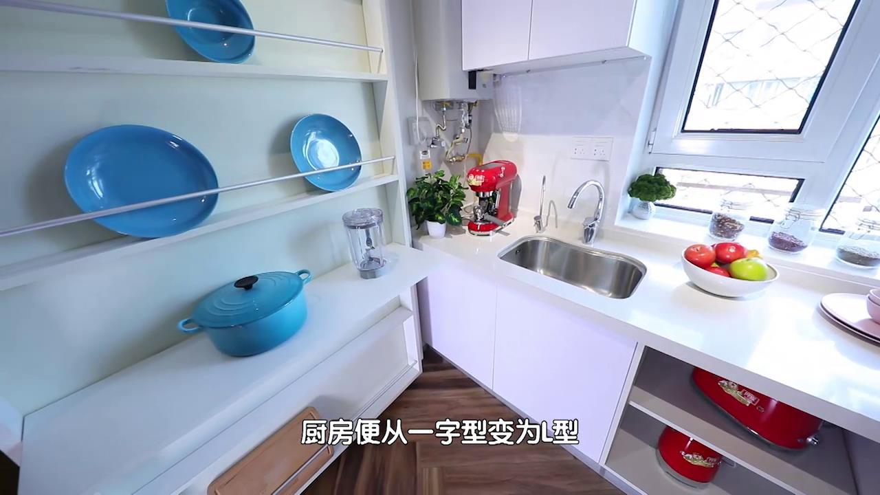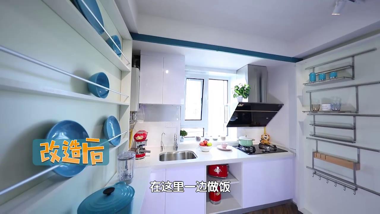 当初为了实现门厅和厨房乾坤大挪移,排烟管道的走向问题着实难住了设计师,如今的排烟管道走房顶,通向天井的窗户,为了保证中间走路区域的高度不变,设计师让其贴着顶部的边缘走,其他区域藏在顶柜里,这样既不影响美观又解决了厨房的排烟问题。白色的橱柜整洁大方,在这里一边做饭,一边看着窗外的风景很是惬意。厨房的操作台面如果不够,超级隐形门里还藏着一个岛台,拉出岛台,厨房便从一字型变为L型,使用起来更加方便。 暖暖的新家