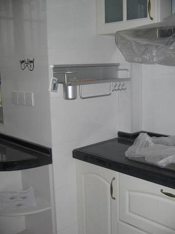 我家超级实用的五金件上场。厨房的,这一张上的五金架很实用,可以放调味罐,各种挂的铲子,以及筷笼。