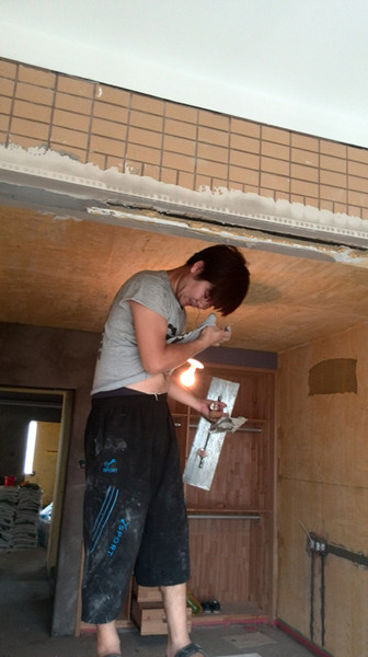 阳角都已经批了一遍!这个师傅跟我还是老乡呢!好像迷到眼睛了!