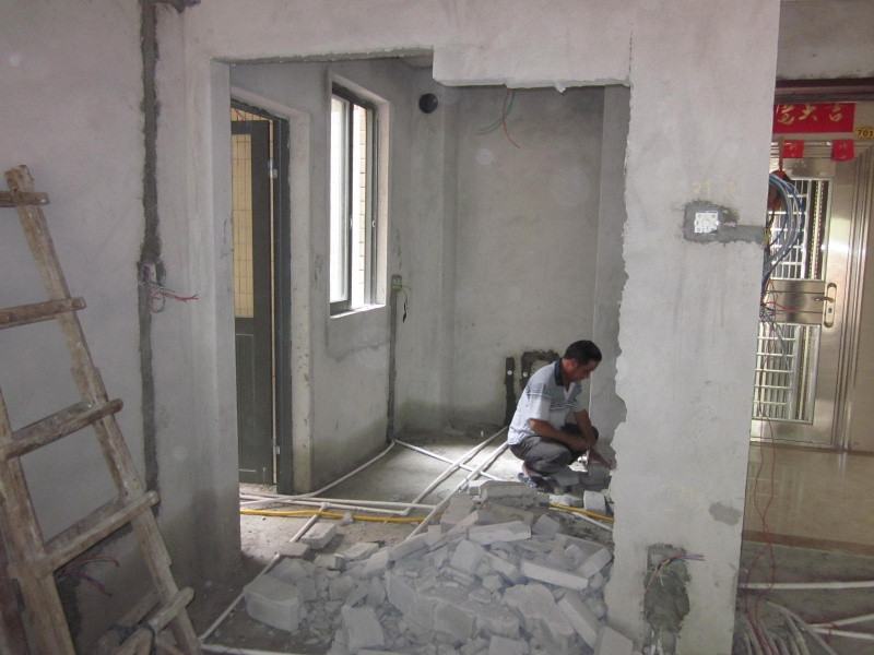 上几张照片:一个负责拆厨房门口的墙,一个负责拆卧室的墙。