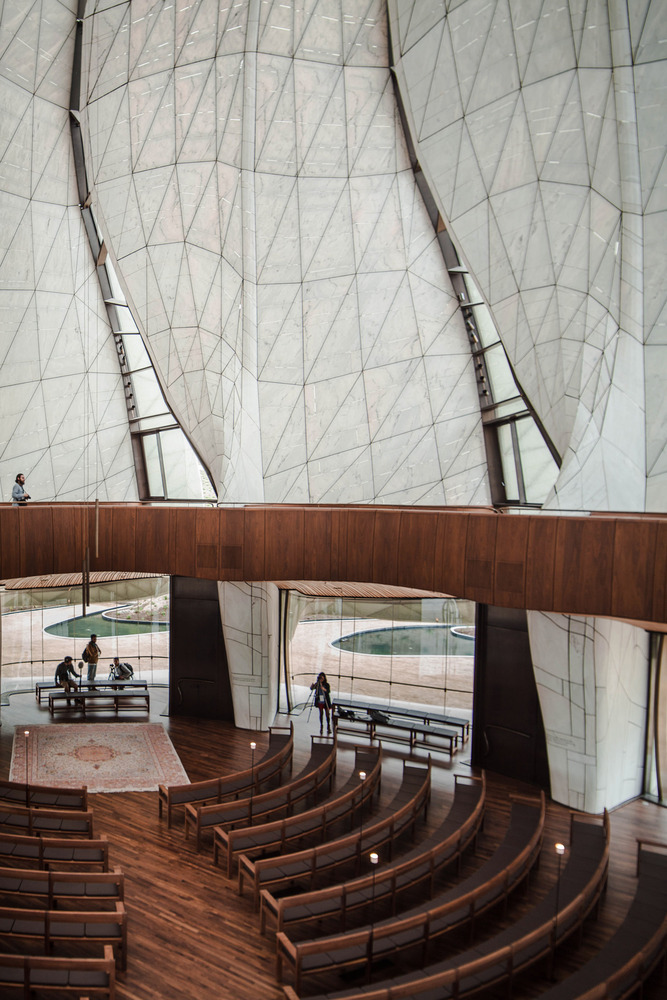 巴哈伊寺庙实际上是一座用于祭祀、祷告和冥想的宗教性建筑,整个建筑神秘地突兀在旷野中,而进入室内,则有一种神圣而崇高的氛围。