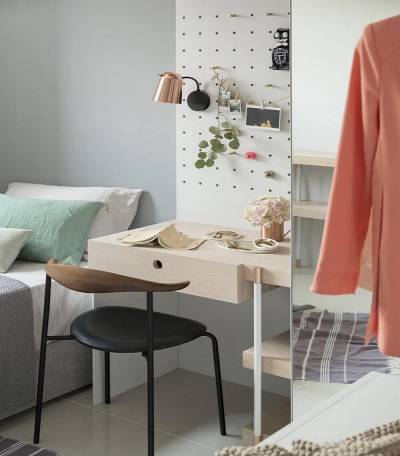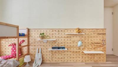 2.儿童房洞洞隔板,化身可调整式书桌!看似普通的洞洞板与隔板的规划,其实暗藏玄机!除了基本收纳小孩玩具的作用,将面积较大的隔板,当作儿童的使用书桌,而隔板灵活变化的特性,还能随时依照小孩的身高做调整。