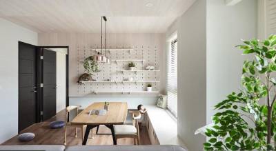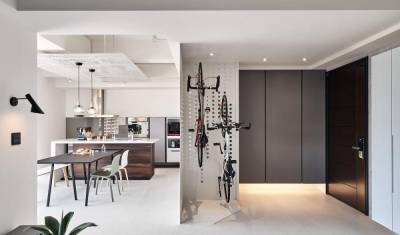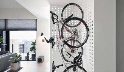 10.自行车垂直挂墙,趣味屏风超便利!别具巧思的洞洞板屏风,利用较为坚固的材质,并设计好相应的隔架,让较重的自行车垂直收纳时,能精准卡隼入洞,无须担忧摔落等问题。而挂置玄关屏风处的大型脚踏车,也能为室内增添些隐蔽感。