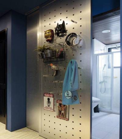 9.耳机、个人收藏一起挂,浴室门化身宝物展示博物馆!别以为洞洞板只有木质设计,仿佛如钢铁般坚固,且不易受潮的金属质洞洞板,非常适合打造为浴室门片!两用的聪明设计,将收藏品挂置门上,让珍藏已久的宝物也拥有自己的展示舞台。