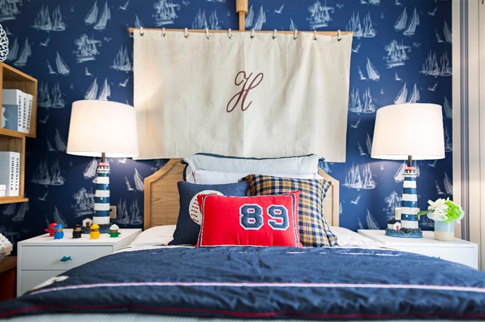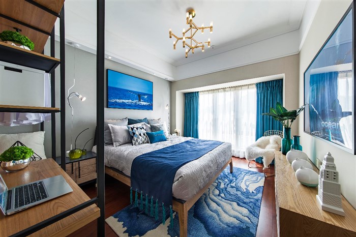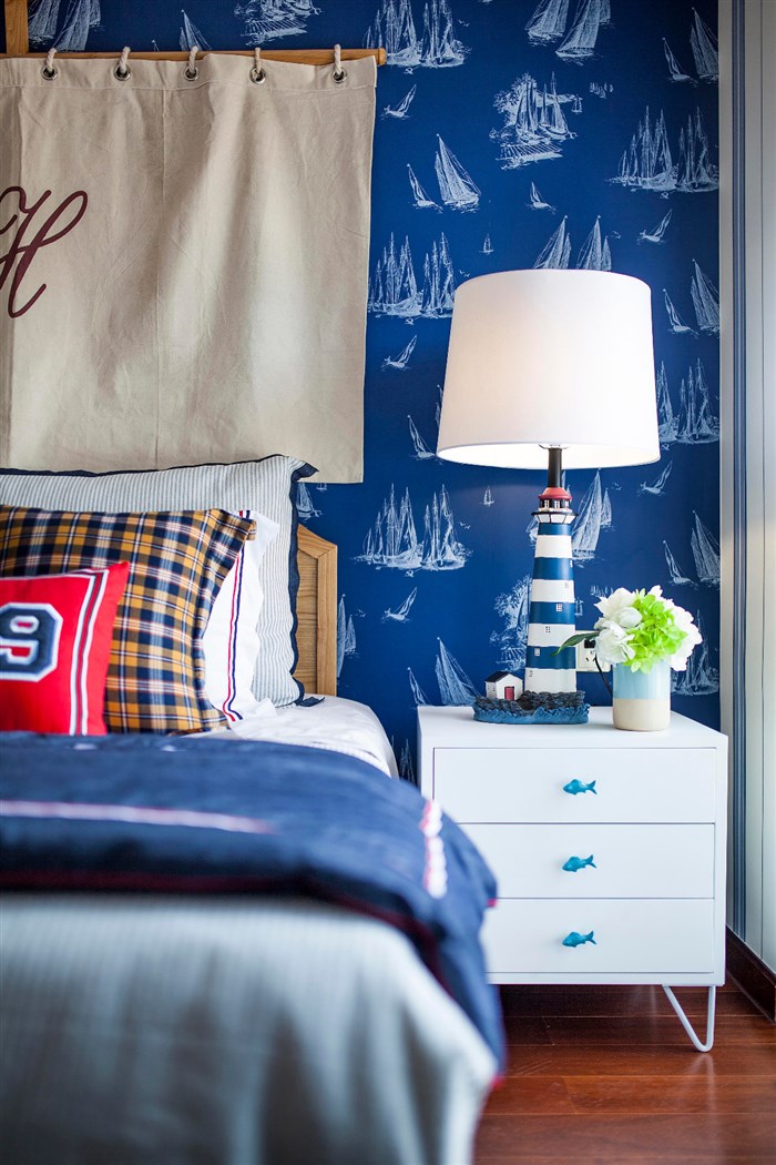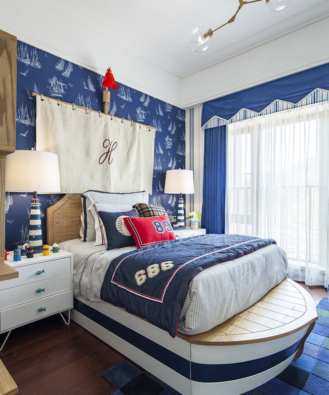 小孩房。“我是要成为海贼王的男人”——采自《海贼王》自白,享受在海洋中翱翔。是否看到一望无际的海洋就在你眼前,向你招手?错落有序的组合收纳柜,放置着满满的童趣小玩意。一一展现出孩子对海洋的热爱与向往。仿佛船缓缓的开往大海,感受到风轻轻的吹过,海鸥在耳边飞过,海浪拍打的声音不停的回荡在风中。。
