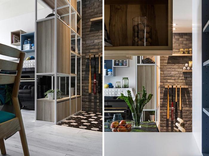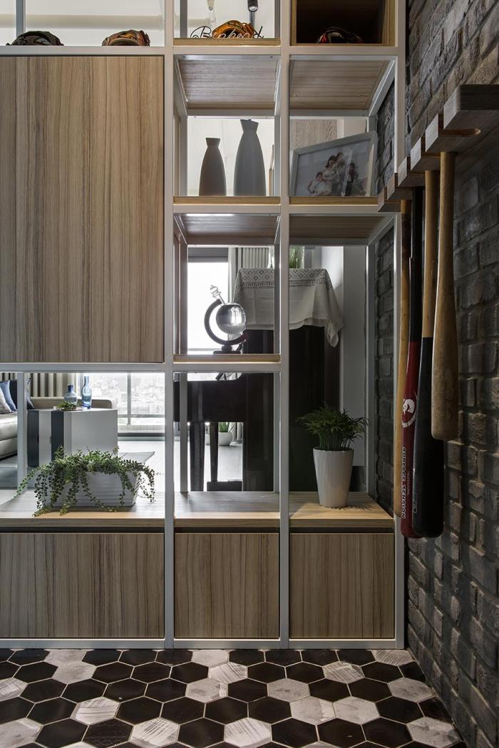 玄关侧设置铁件搭配系统收纳柜,铁件的线条正好形成一道隔屏的作用,让一进门不至于直接看到屋内的样貌,也不会产生压迫感。