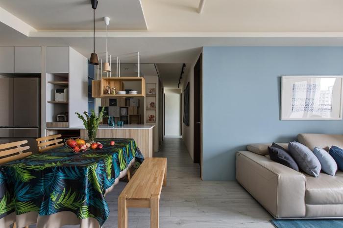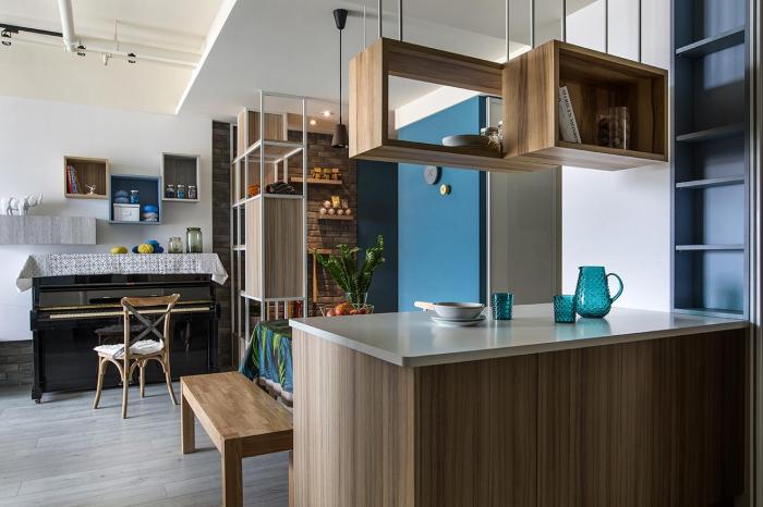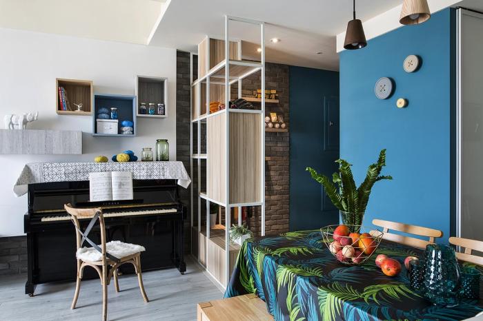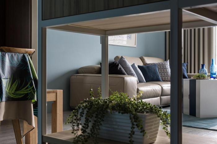 餐厅为开放式设计,颜色上选用白和蓝将练琴区与餐厅区隔开,这种色彩的搭配创造出对比但又十分和谐,同时还给人如海洋般的疗愈感受。