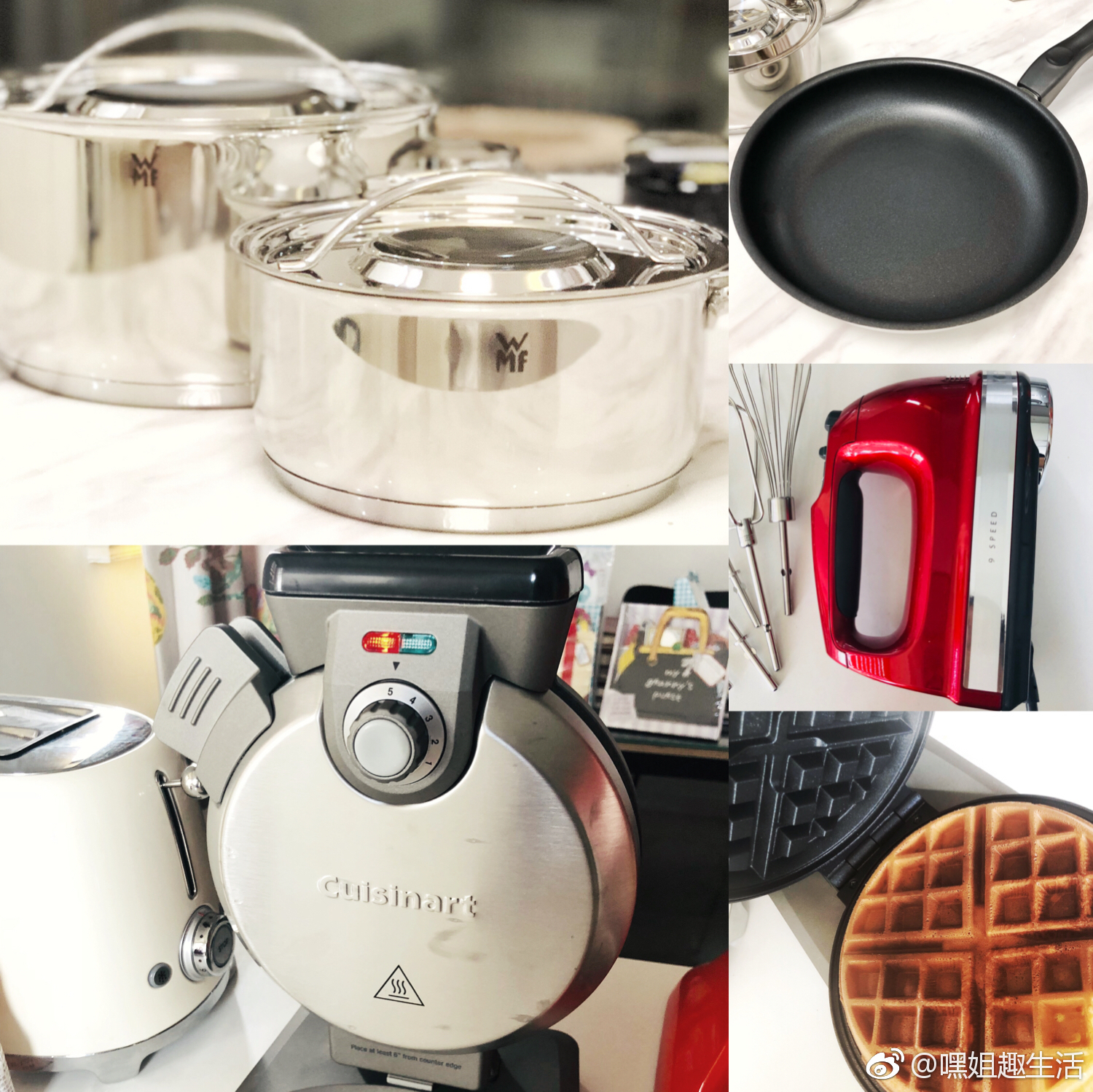 喜提厨房新工具️️️厨房是一个家最有烟火气的地方,也最值得用心挑选好厨具,毕竟对吃货来说,没什么比变着花样吃更让人开心的了跟大家分享下最近新入的三件神器!?WMF锅具组三件套这已经是我的第二套WMF锅具了。不锈钢材质,拿到手简直蹭亮得舍不得用!一个16CM奶锅、一个20CM炖锅和一个24CM煎锅。必须提一下煎锅炒鸡好用,煎牛排完全不粘,煎完之后还非常好清洗,一点点洗洁精刷一下就好了。WMF1930年就用了不锈钢材质,他家的不锈钢除了光泽度很出色,还有抗酸性,不易被化学物质侵蚀,毕竟锅具最容易洗着洗着就发黄生锈。锅底很厚实,还微微有些内凹,能保证受热平衡。电磁炉、煤气灶、电陶炉都能用。总之大爱️摩拳擦掌准备再入一套大炒锅!?kitchenaid手持9速打蛋器虽然已经有一个台式厨师机,但是手持有手持的好处,更方便更快速,适合快手早餐使用。唯一一款9速电动打蛋器,打开的时候默认一档,根据自己需要往上升速。配了打蛋网、2个搅拌头、1个液体搅拌桨和2个勾面头,可以搅拌、打发奶油,双头操作所以搅拌任何原料都是神速,也能打出非常细密的蛋白。图上是我做的松饼。配料很简单:1⃣️松饼粉150G2⃣️鸡蛋2个3⃣️牛奶100ML我先搅拌了鸡蛋再搅拌面粉牛奶,图快也可以全部加在一起直接搅拌。2-3分钟面糊已经完全融合了。?cuisinart直立式松饼机是在看孝利家民宿被允儿种草的松饼机,直立式,操作方便又不怕漏,找的代购等了有一个月才收到事实证明等待是值得的!之前打发的面糊,用配的小勺灌入机器里,1勺就能做一份松饼了,千万不要多灌会溢出来。松饼?香软可口,一下就成型了,前后不过四五分钟,快手又好吃的早餐就属它了!