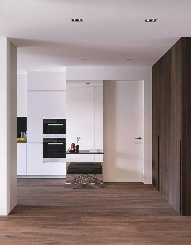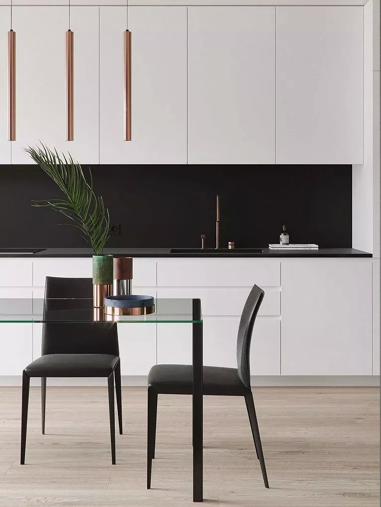 整个餐厅和厨房显得干净简单,无半点杂物,家具的实用和摆放都是恰到好处,特殊定制的储物柜,让家中的杂物都可以收纳妥当,色彩深与浅的鲜明对比下,呈现出利落且质感的视觉效果。