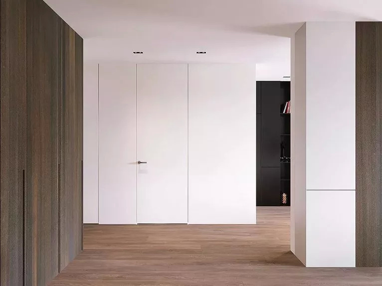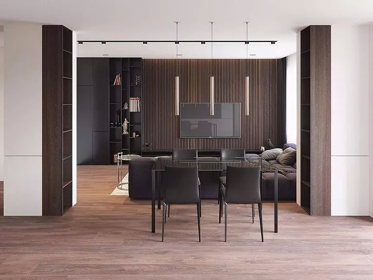 一进门就可以看到深色的木质元素让整个房间沉稳且有质感,而白色的背景墙则让房间充满了灵动的氛围