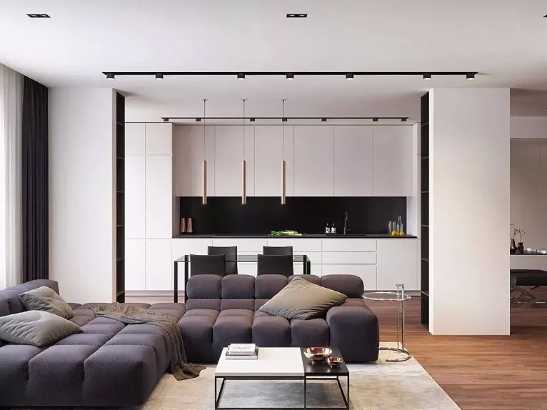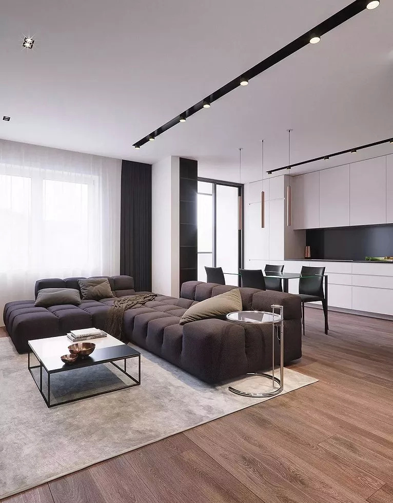开放式的餐厅和厨房,让整个空间衔接更加灵动紧密,深灰色的转角沙发与整个空间的格调十分的相符,利落的黑色调点缀,更显质感。