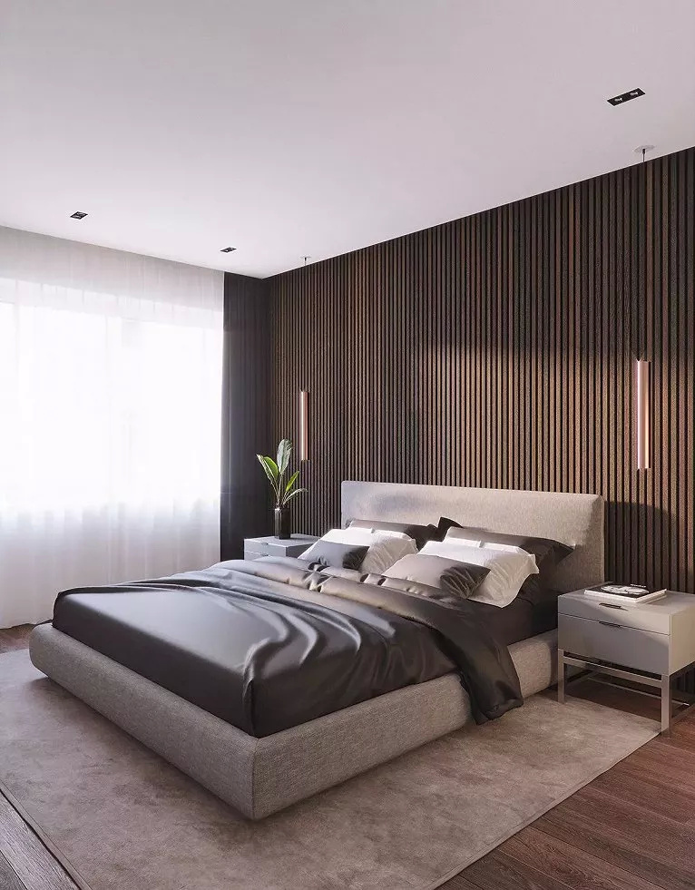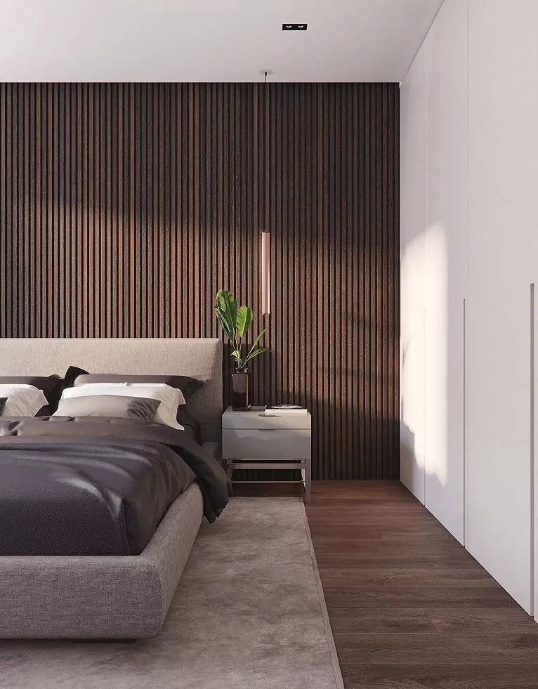 卧室以深色木条装饰的床头背景搭配上客厅的电视背景墙相互对应,木质元素原有的厚重且温馨的属性,装点出温馨惬意的睡眠感受。