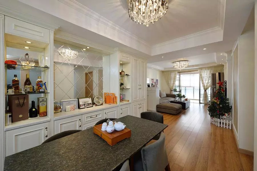 ▲深色的餐桌餐椅搭配白色的餐边柜,显得静雅大方。而留空的墙面做了镜面处理,柜中的摆件也因此更具精致质感。