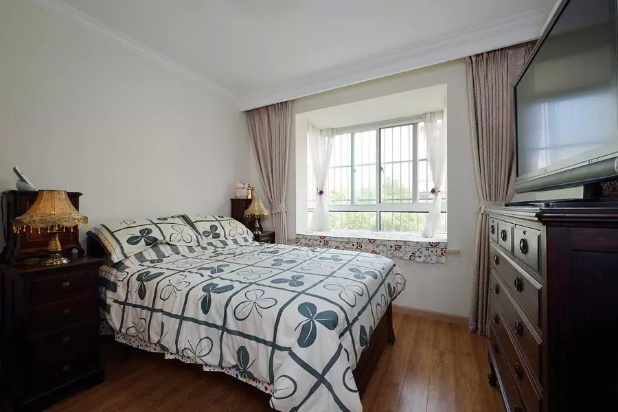 ▲床头背景墙做了边框造型处理并辅以壁纸作装饰,配合浪漫碎花的被单,精致高雅又不失情趣温情。