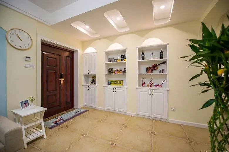 ▲进门左侧的墙体是三处入墙式的展示+收纳的鞋柜,天花也同样做了三处椭圆造型吊顶,营造了别致的空间感也带来了情趣温馨。