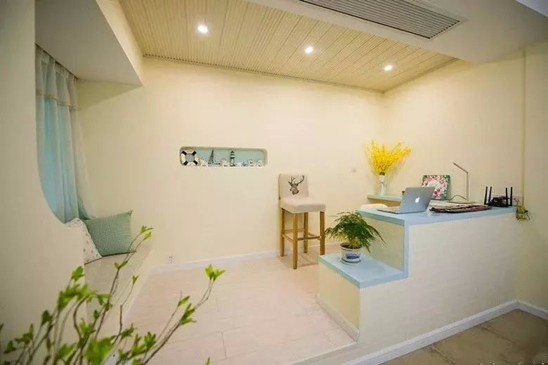 ▲客厅旁边抬高做了一个休闲+办公的空间,浅蓝的阶梯式桌面,错落地摆上绿植,显得格外的自然清新。