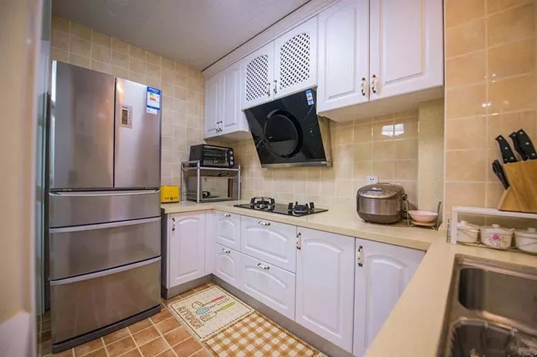 ▲L型的厨房布局,在暖色的空间基础上,以白色的橱柜和方格地毯,带来了田园风的亲切感。