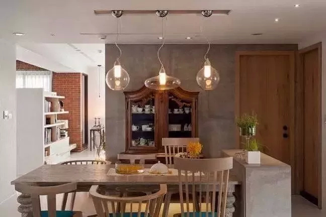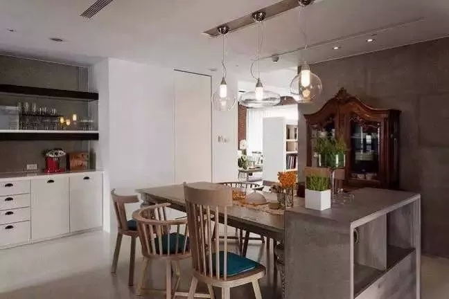 ▲ 餐桌是大多数家庭的选择,原木餐桌搭配六把温莎椅,温润的木质让我们也感受到了那份温暖,三盏柔和的小吊灯陪着这对小夫妻,享受美好的就餐环境。