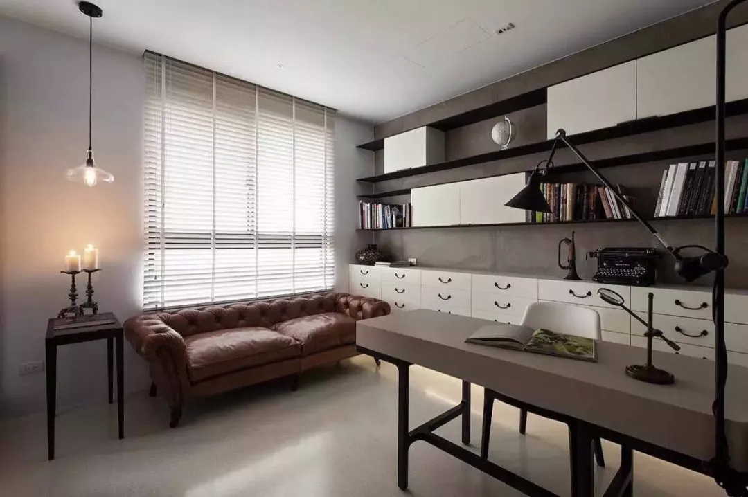 ▲ 黑色书桌搭配时尚现代感的台灯,非常简约有范,百叶窗前摆放了一张棕色沙发,累了躺在这里休息会,或者看看书,感觉自己好优雅,好有气质。