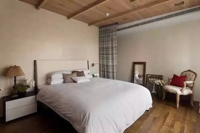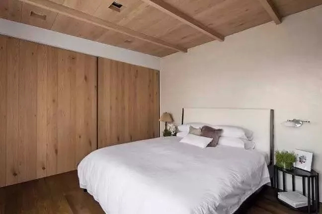 ▲ 主卧集宽敞、简约和舒适于一体,原木吊顶和地板砖上下呼应,白色背景墙和床品搭配,营造舒服、干净的小窝。