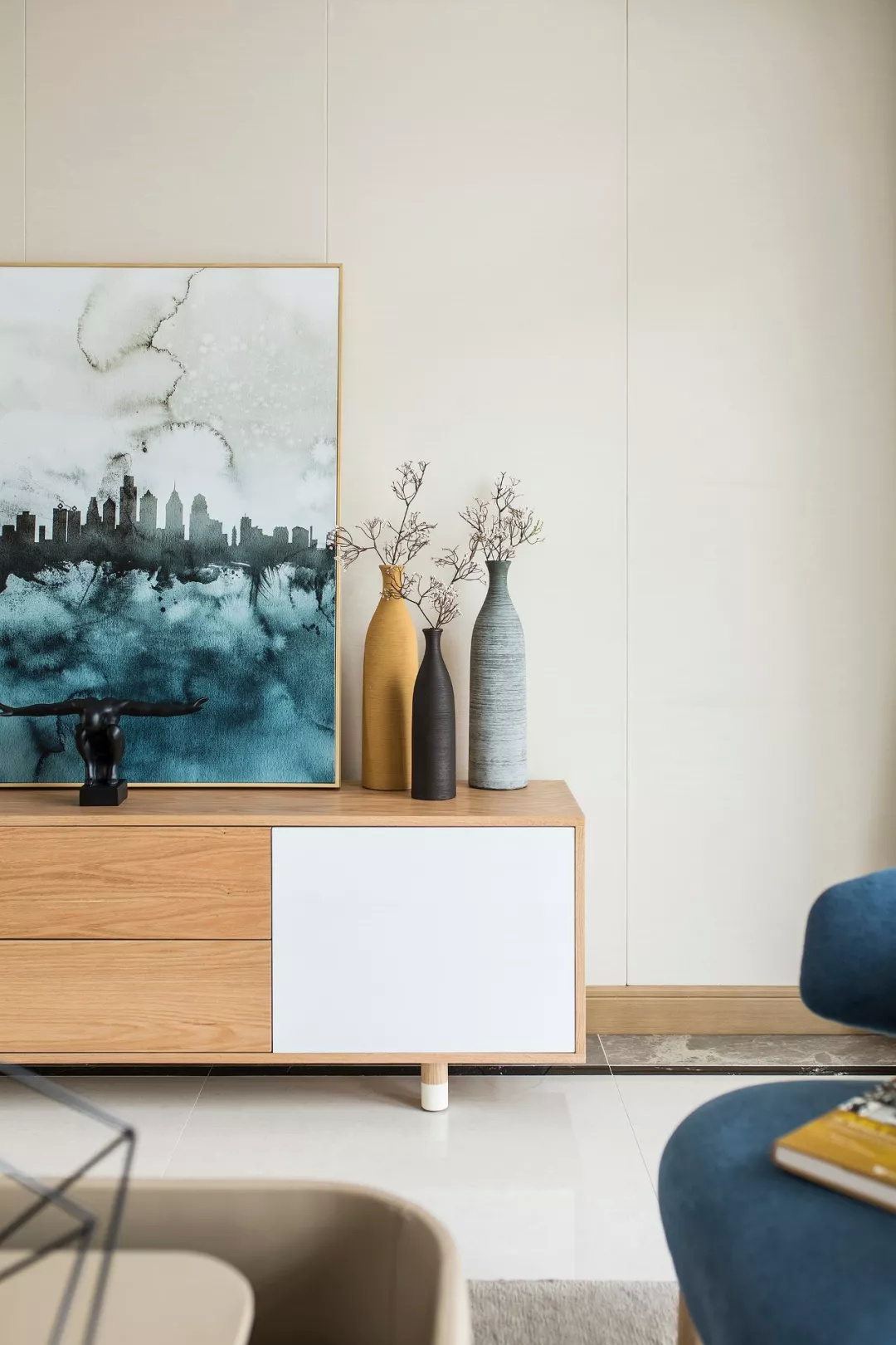 ▲原木色与白**撞的电视柜,放弃电视,取而代之的是一幅现代装饰画,摆上三瓶禅意端庄的干花,也很落落大方。