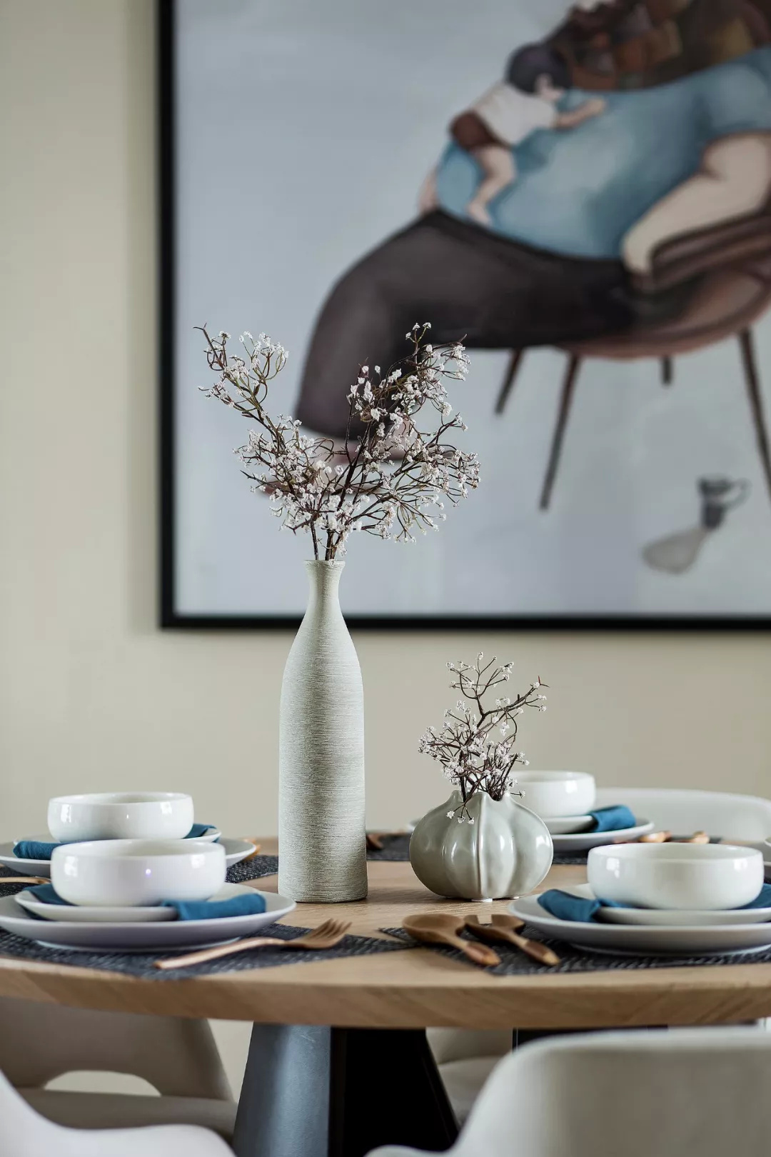 ▲原木餐桌上摆有几套精致的餐具,而餐桌中央的干花,颇有几分清新雅致。