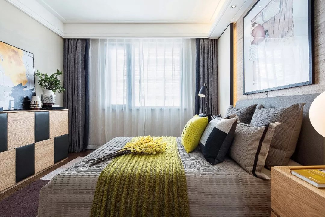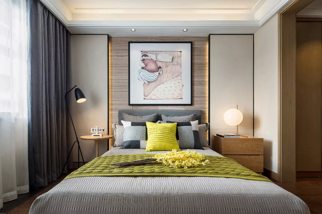 ▲主卧床头背景墙是中间低两侧高的布置,结合两侧墙面的背光,丰富了墙体的层次感。而墙面一幅趣味装饰画,更是将男主人的家庭地位表现得淋漓尽致。