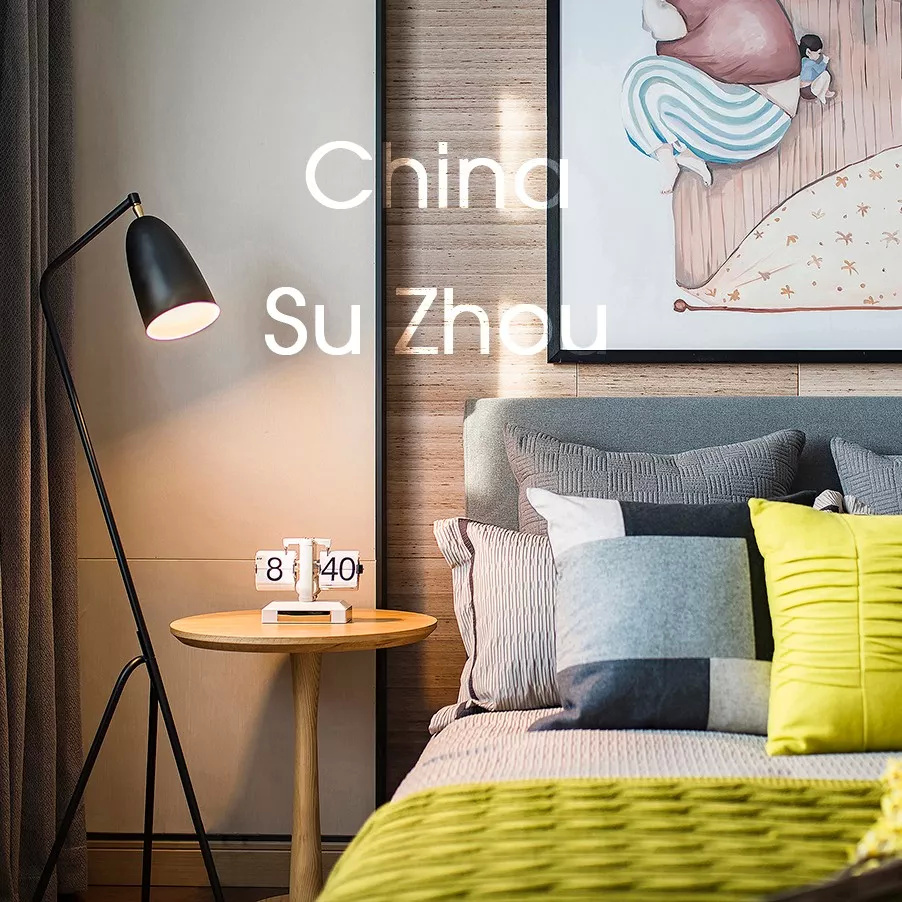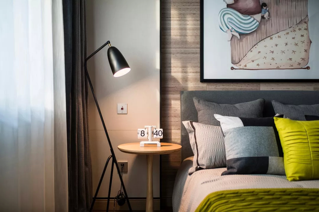 ▲一盏简约的铁艺落地灯,强调了床头闹钟的妙趣。